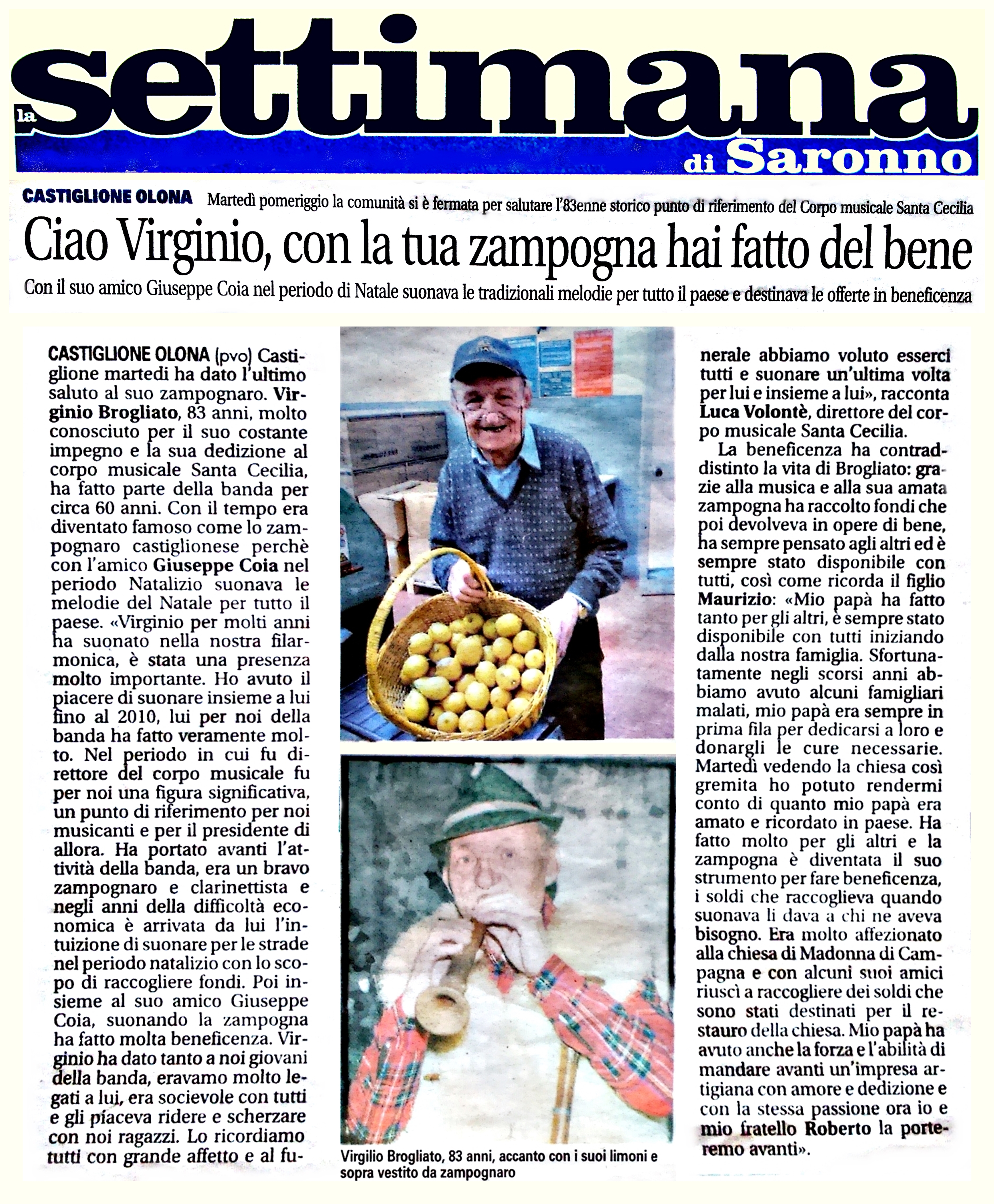 « Ciao Virginio, con la tua zampogna hai fatto del bene »