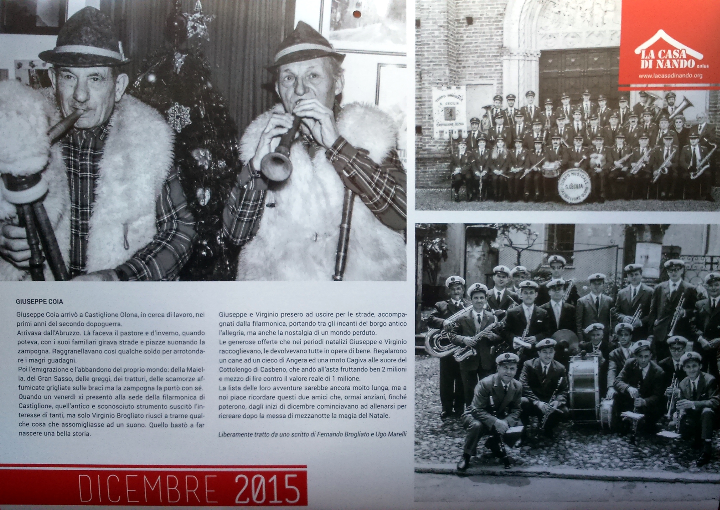 Al nostro Corpo Filarmonico "S. Cecilia" e ai nostri storici zampognari Giuseppe Coia e Virginio Brogliato è stato dedicato il mese di dicembre del calendario 2015, realizzato dall'associazione di Gazzada Schianno "La Casa di Nando".
